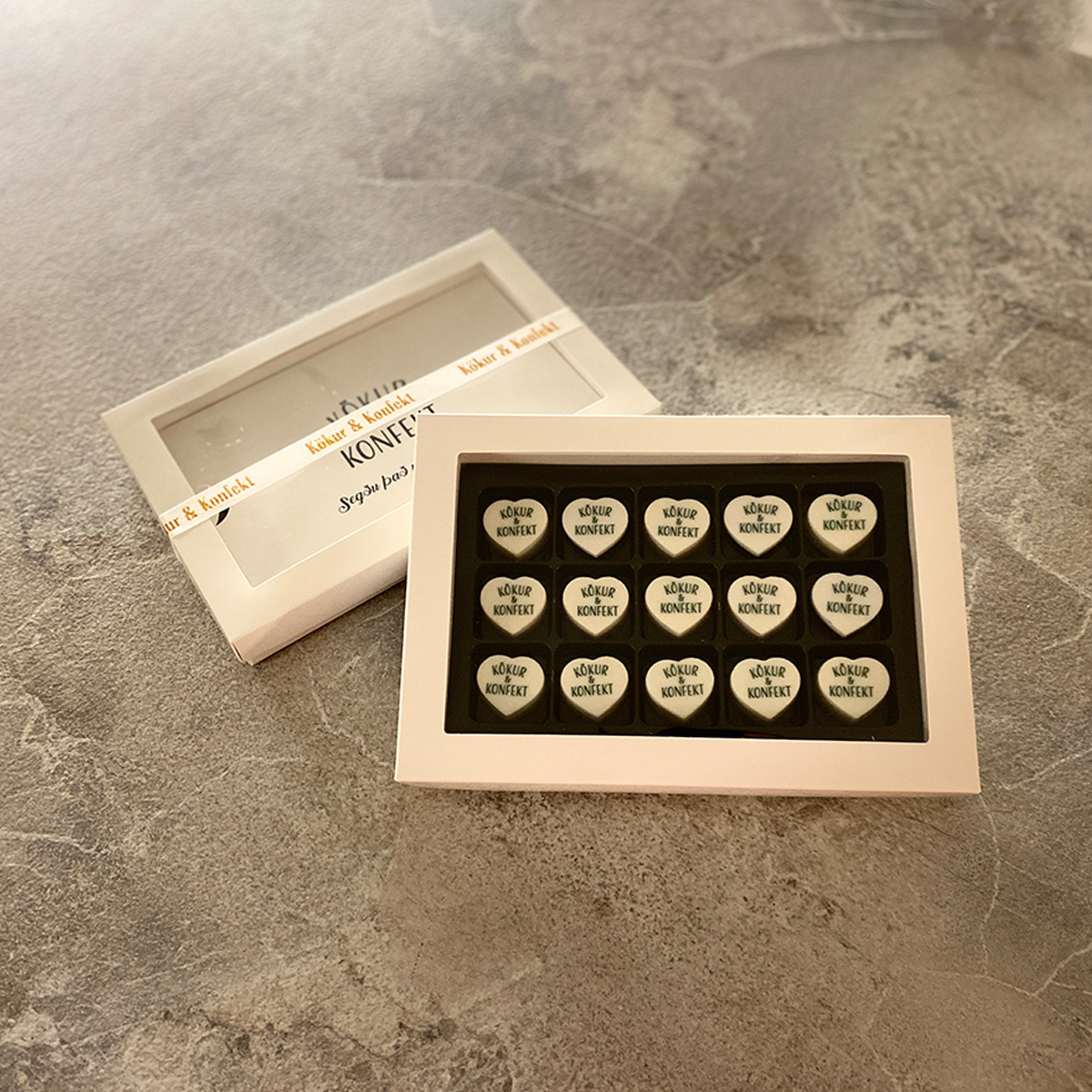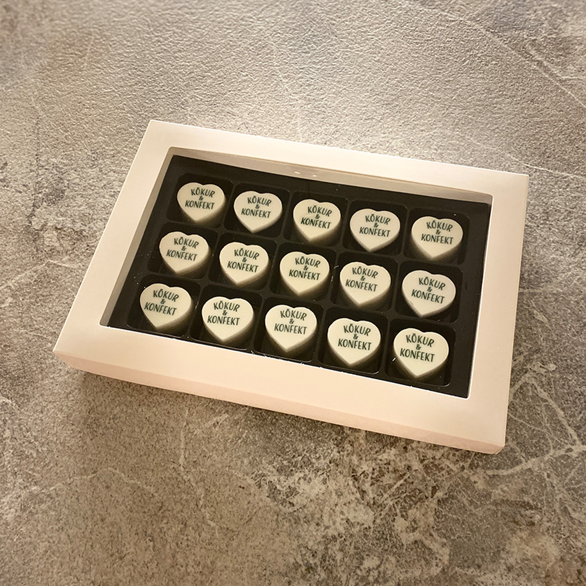 Falleg gjafaaskja með 15 sérmerktum súkkulaðimolum.