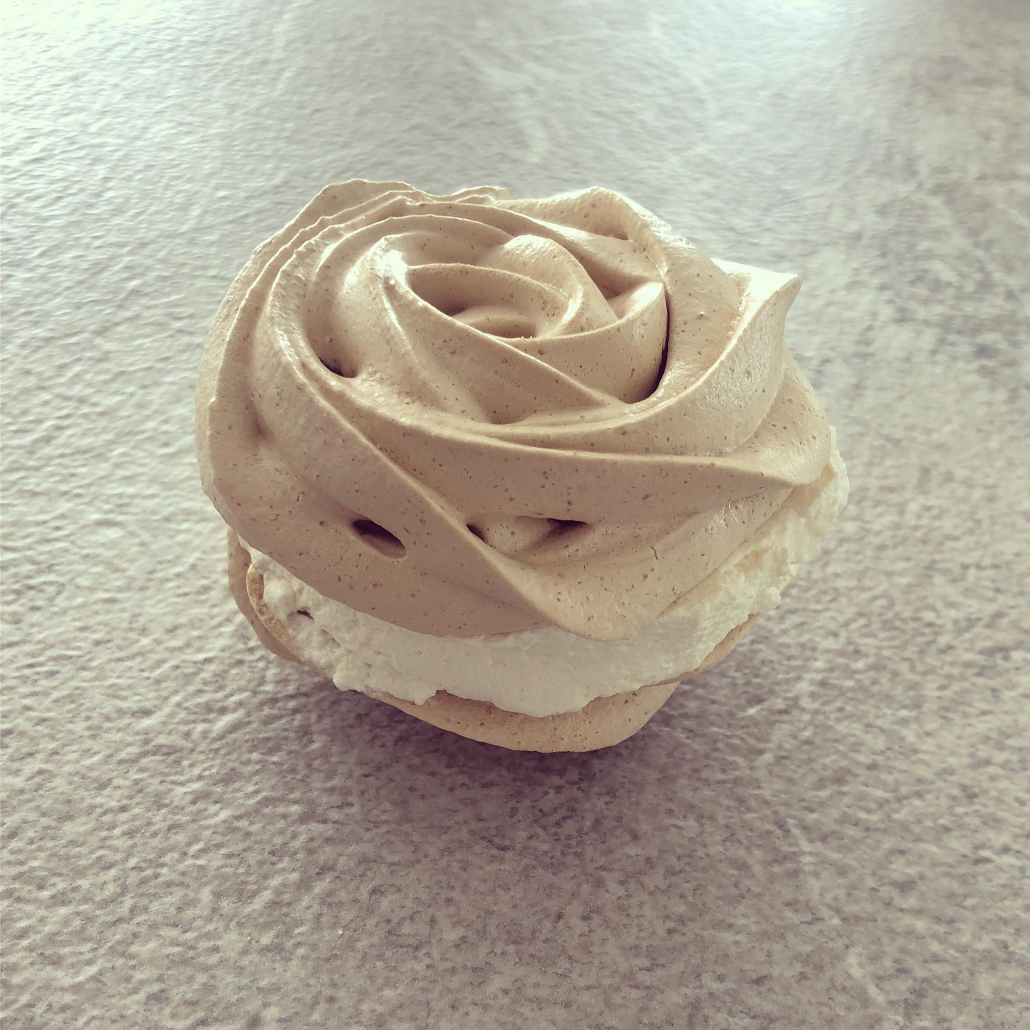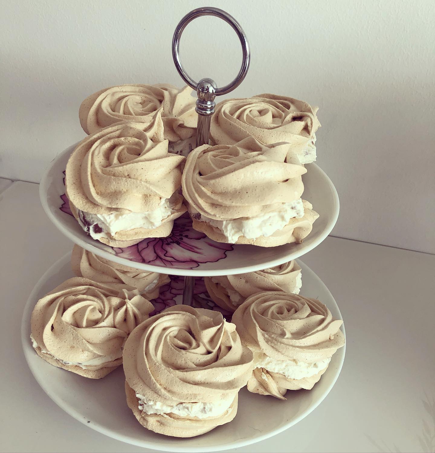Ljúffengar litlar marengs rósir með rjóma, karamellu, hnetum og súkkulaði.